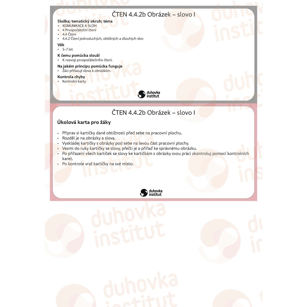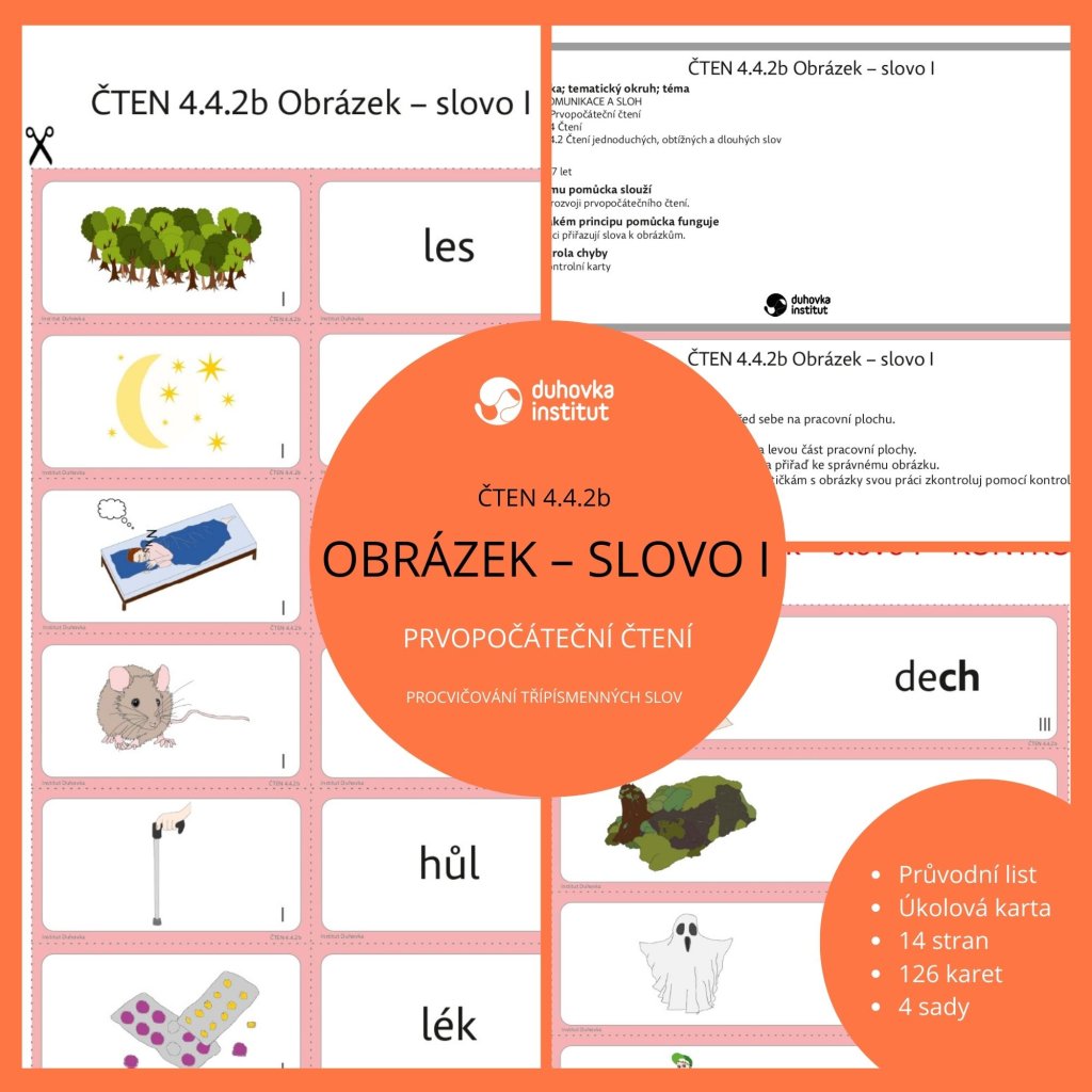 — 42 kartiček se třípísmennými slovy rozdělených do 4 sad (slova souhláska-samohláska-souhláska; slova se shlukem souhlásek; slova s ch; slova s tvrdými a měkkými souhláskami)
