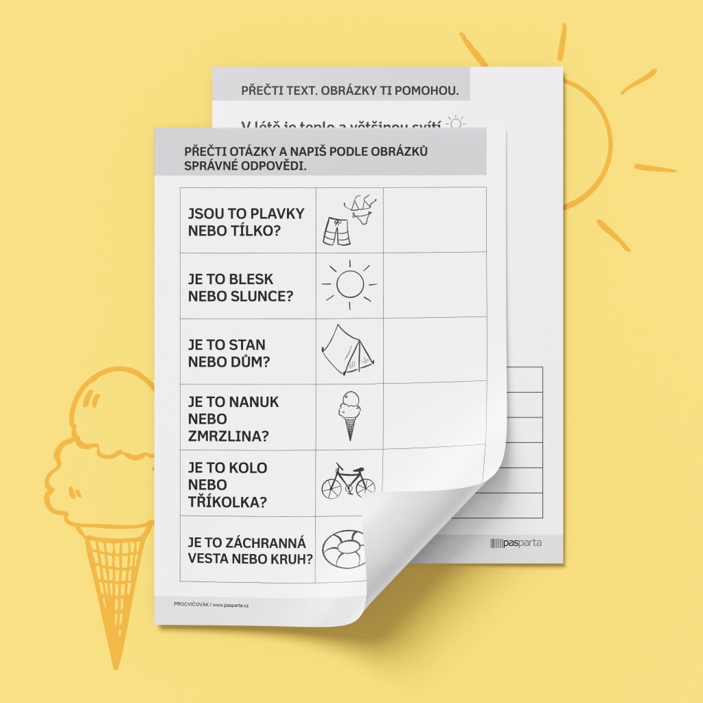 Materiál obsahuje 12 pracovních listů, které zábavnou formou, se spoustou ilustrací, zpracovávají téma léta. Pracovní listy vycházejí z metody postupných kroků a jsou řazeny od jednodušších po složitější. Začínáme s porozuměním jednotlivým slovům, pokračujeme porozuměním celým větám a končíme krátkým textem, v jehož závěru se ověřuje, jak mu dítě rozumí.