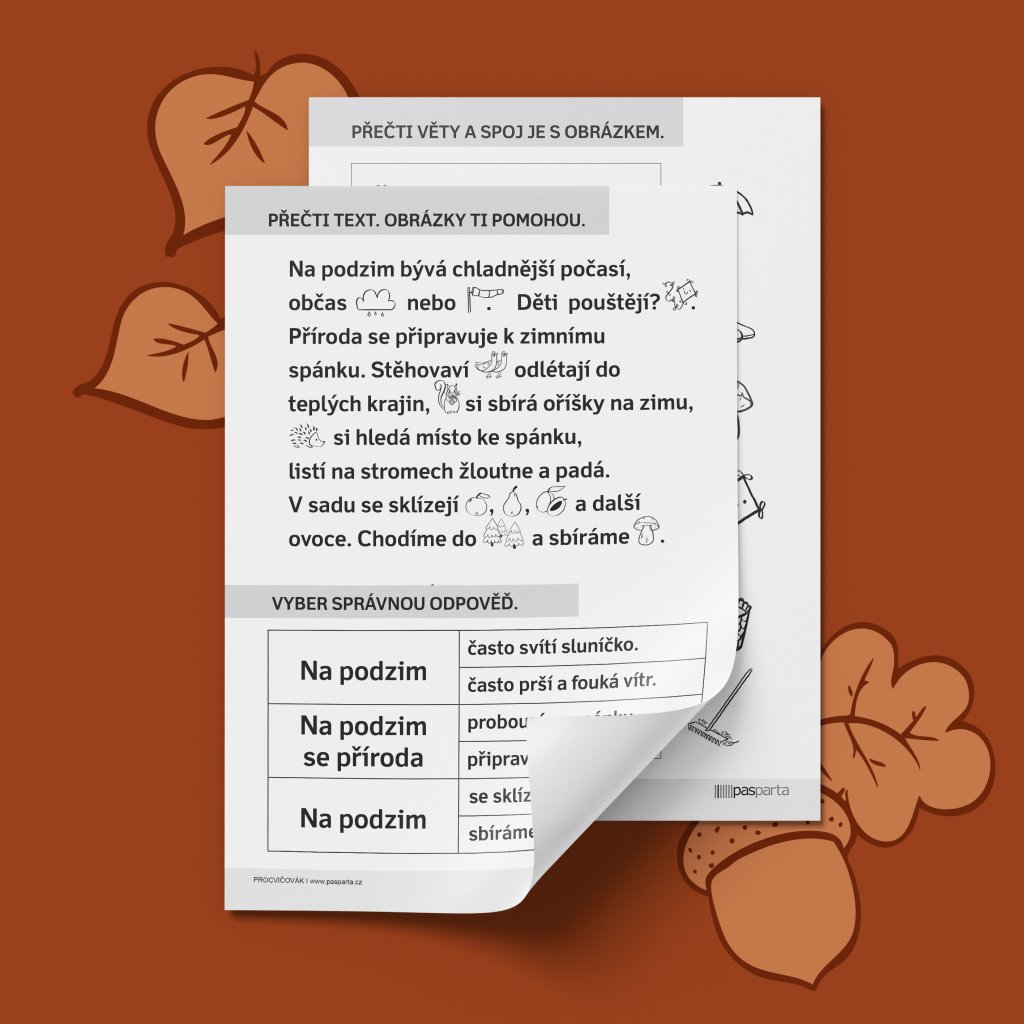 Materiál obsahuje 16 pracovních listů, které zábavnou formou, se spoustou ilustrací, zpracovávají téma podzimu. Pracovní listy vycházejí z metody postupných kroků a jsou řazeny od jednodušších po složitější. Začínáme s porozuměním jednotlivým slovům, pokračujeme porozuměním celým větám a končíme krátkým textem, v jehož závěru se ověřuje, jak mu dítě rozumí.