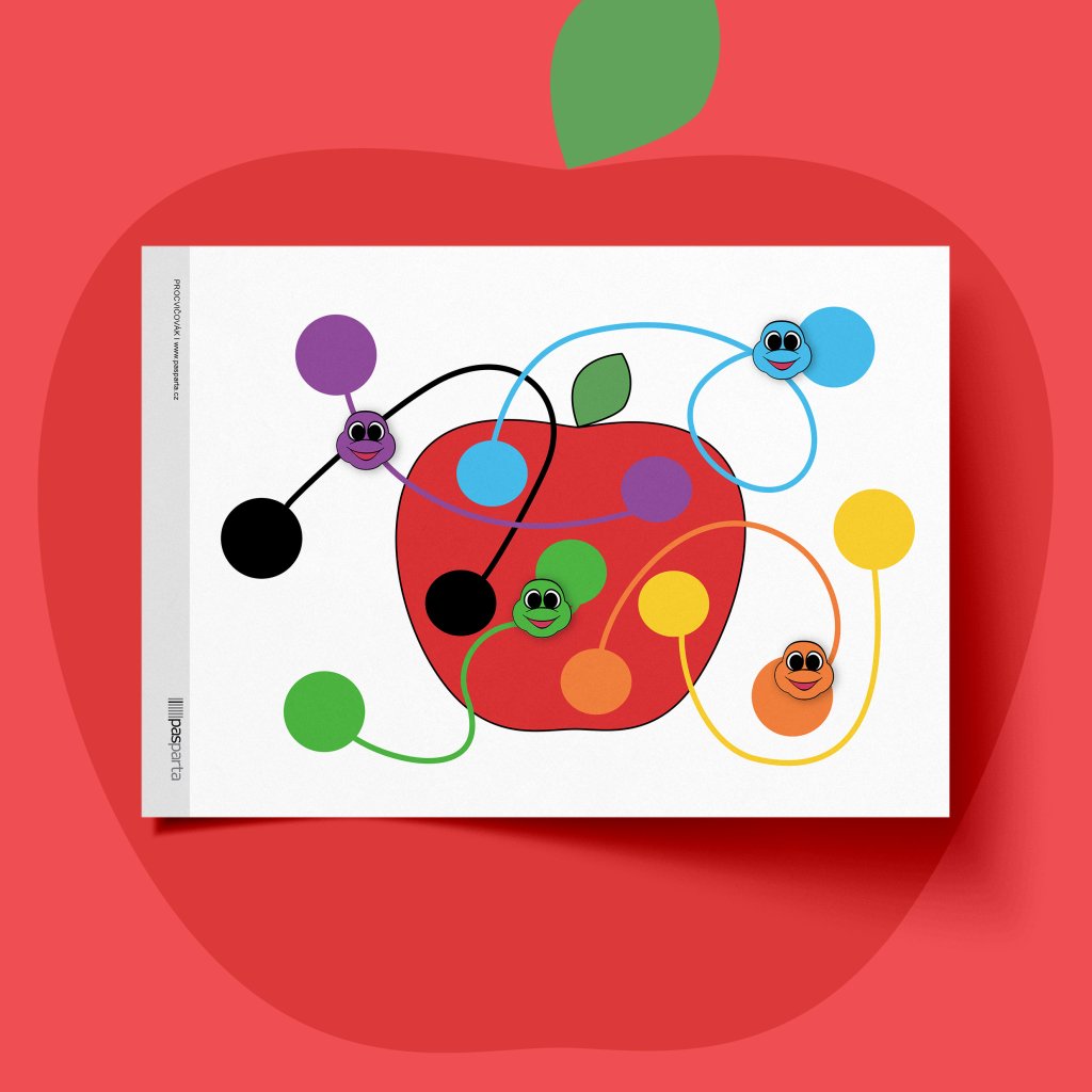 Materiál obsahuje 2 pracovní listy: 1× list s podkladem (obrázek jablíčka s barevnými červíky) a 1× list s hlavičkami červíků