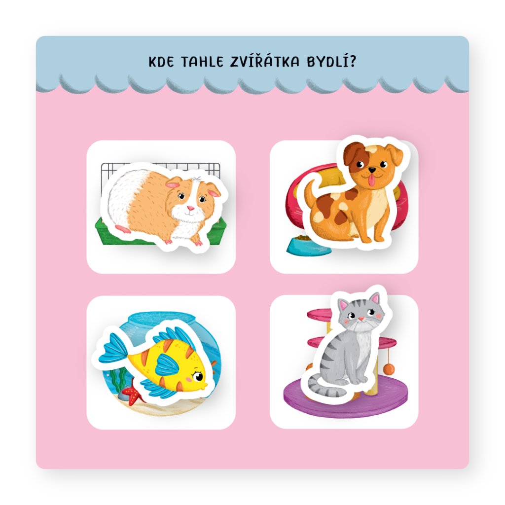 Součástí jsou prvky na suchý zip – zvířátka – které lze snadno přemisťovat a opakovaně používat.