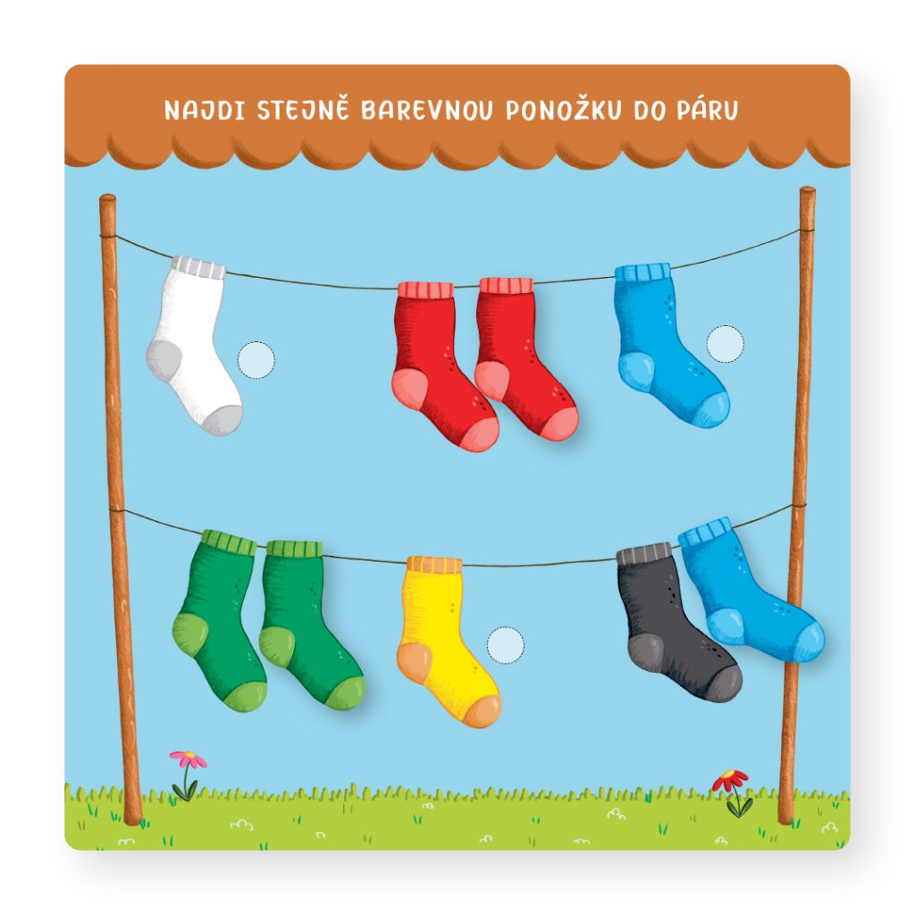 Součástí jsou prvky na suchý zip – barevné ponožky – které lze snadno přemisťovat a opakovaně používat.