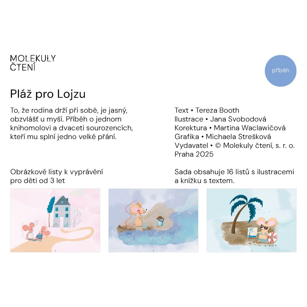 Lojza je vášnivý čtenář, má dvacet sourozenců a jako jediný z nich umí číst. Často jim vypráví, co se v knížkách dozvěděl. Ukazuje jim, jak to vypadá jinde ve světě. Sní o cestě k moři. Jenže kterým směrem se vydat? Sourozenci dostanou nápad. Vydají se hledat moře, nebo si moře najde Lojzu? Dojemný příběh o myší rodině, která táhne za jeden provaz.