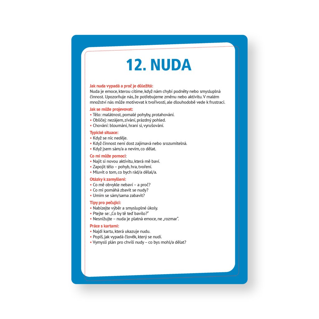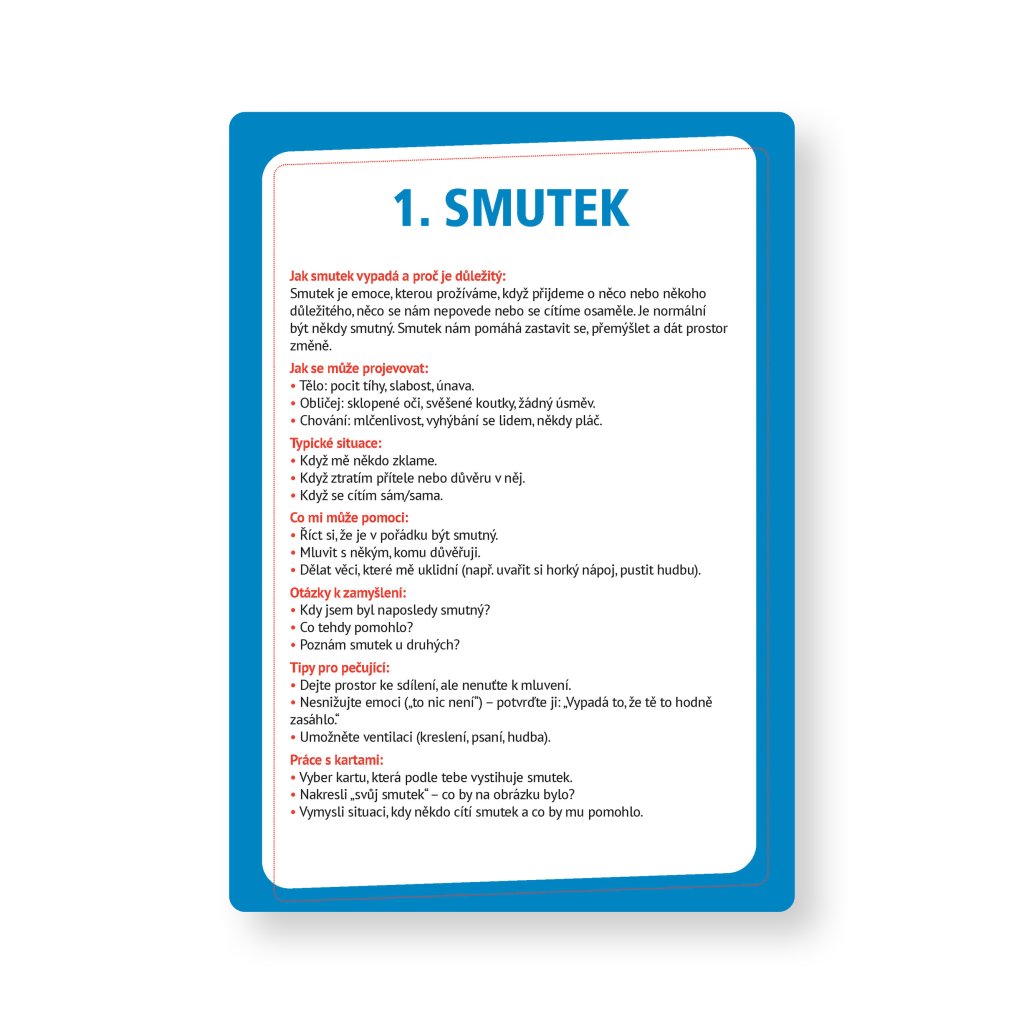Karty zobrazují emoce formou fotografií i jednoduchých kreseb a zahrnují široké spektrum pocitů – od radosti, smutku, strachu až po naději, žárlivost či hrdost.