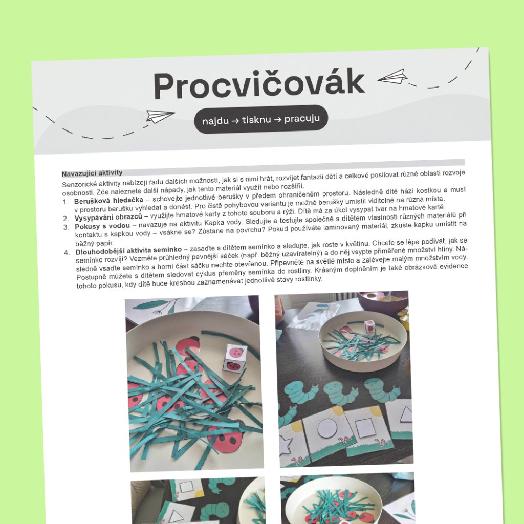 Senzorické hraní, které má mít přesah také do vzdělávání, vyžaduje interakci průvodce, a proto i zde je důležité s dítětem vhodně pracovat a aktivitami jej provázet. Více informací najdete v popisu úloh. Aktivity vždy přizpůsobte věku dítěte a jeho schopnostem. Práce s materiálem vyžaduje dohled dospělé osoby.