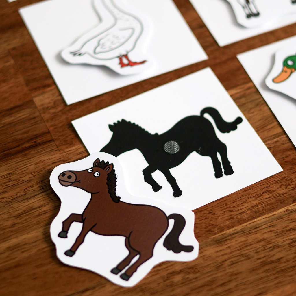 Sada šesti kartiček s domácími zvířaty a jejich stíny. Stínovými obrázky můžeme trénovat zrakové vnímání a rozlišování či slovní zásobu.