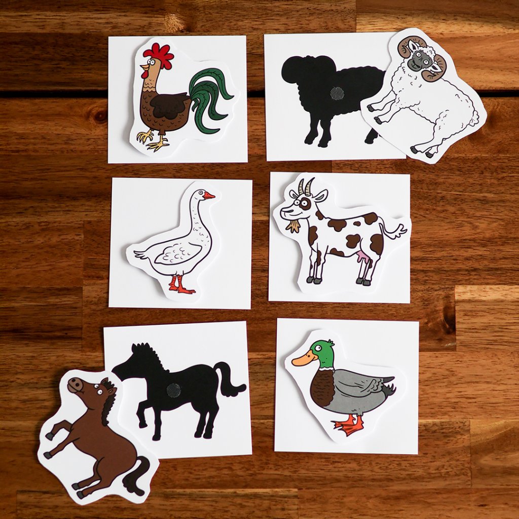 V sadě naleznete 6 karet se zvířaty: kohout, beran, husa, koza, kůň a kačer + jejich stínové dvojice