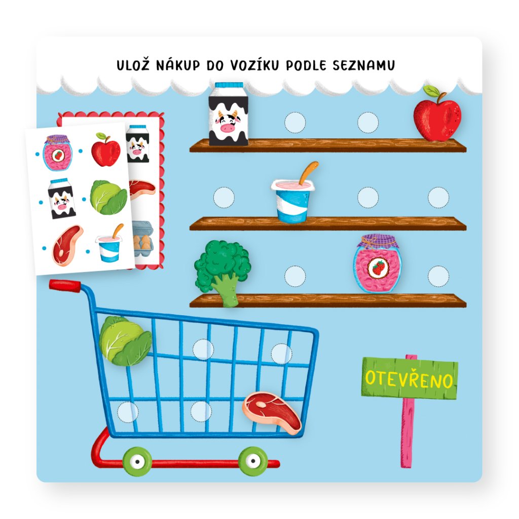 Součástí jsou prvky na suchý zip – jídlo a nákupní seznamy – které lze snadno přemisťovat a opakovaně používat.