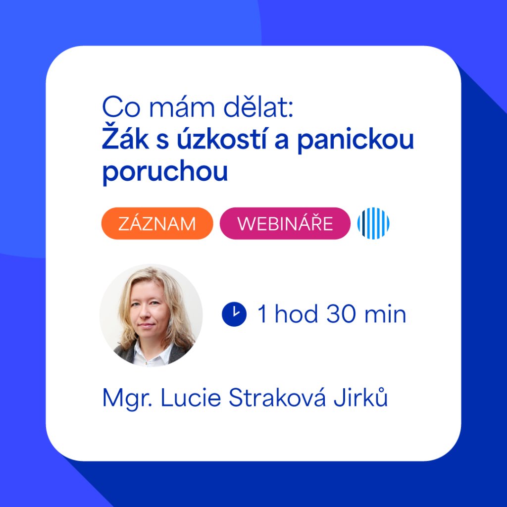 Jak můžeme z pozice pedagoga, asistenta pedagoga či rodiče podpořit dítě, žáka či studenta, který se potýká s úzkostnou či panickou poruchou? Jakou podporu mu můžeme nabídnout z dlouhodobého hlediska a jak se zachovat během probíhající panické ataky? Co je podstatou těchto obtíží, jaké jsou možné příčiny a projevy a kam dítě či rodinu nasměrovat pro další pomoc?